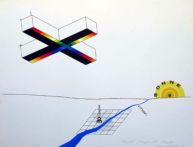 Projekt Fliegende Stadt, 1970, Kasein u. Tusche auf Karton, 50x70cm
