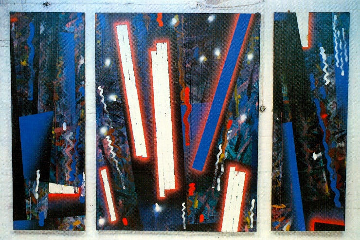 Superstrings, Triptychon, 1985, Acryl auf Leinwand, 200x320 cm, Hess. Landesmuseum Darmstadt