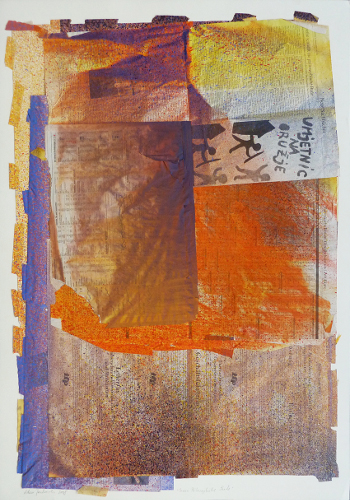 Screen Philosophische Bude, 2008, Acryl+Zeitung auf Karton, 100x70 cm