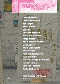 Wer will denn schon den ganzen Tag die Welt verändern? Immer die schönste Malerei... aus der Klasse Prof. Adam Jankowski Nr.4. Hg. HfG Offenbach 2010, Broschüre, 80 Seiten, 29x21 cm, Texte: Adam Jankowski, Christian Janecke. Künstler: Dirk Baumanns, Dorothee Diebold, Jos Diegel, Burak Duvan, Eugel El, Goekhan Erdogan, Sebastian Heinrich, Tanja Herzen, Anne-Kathrin Huisken, Lisa Klinger, Xenia Lesniewski, Erik Pfeiffer, Prae Pupityastaporn, Sven Schuppar, Natalie Sertage-Rodriguez, Melda Temucin, Cornelia Thomsen, Kosta Tsobanidis. Euro 10,- zu beziehen durch die Bibliothek der Hochschule für Gestaltung. |